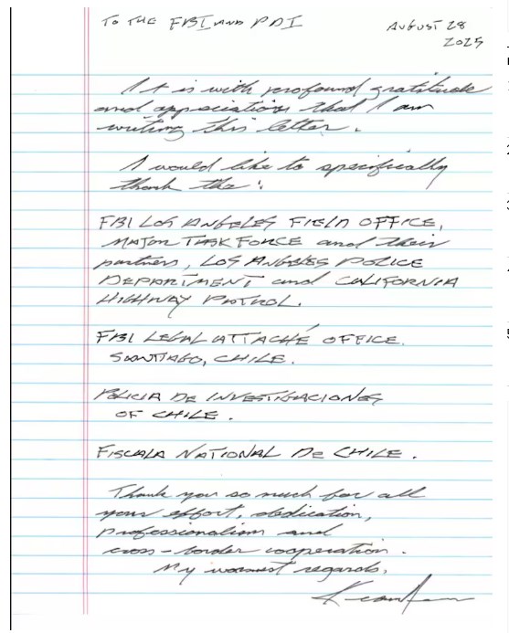“Es con profunda gratitud y aprecio que escribo esta carta. Muchas gracias por todo su esfuerzo, dedicación, profesionalismo y cooperación transfronteriza”, dice parte del escrito. Allí, además de la Policía de Investigaciones de Chile y la Fiscalía de Chile, el prestigioso intérprete canadiense de 61 años menciona a la oficina local del FBI.