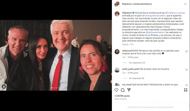 Lo cierto es que estas afirmaciones contrastan y mucho con las que entregó Felipe Kast… y es que el senador compartió una imagen de la cena anual de la Fundación Soy Más, a la que también asistió la Fiera. Pero no solo eso: además, respondió al comentario de una seguidora, quien le dijo que “me encanta verte con la Pame”.