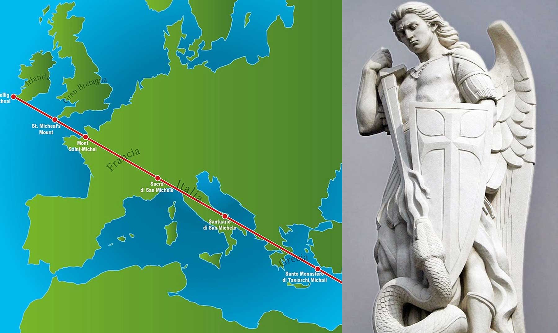 El monasterio que se fundó en el año 588 en la isla-montaña de Skellig Michael está situado hoy en el extremo de una línea recta imaginaria que une siete santuarios construidos en el mundo en homenaje a San Miguel Arcángel, de Irlanda a Israel, configurando en el mapa la forma de una espada.
