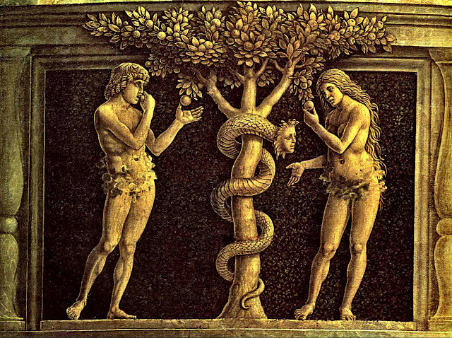 La Biblia relata que cuando Dios supo que la serpiente en el Jardín del Edén, utilizada por el diablo, había tentado con éxito a Eva y luego a Adán a comer del fruto del Árbol del Conocimiento del Bien y del Mal, la maldijo (Génesis 3:14-15): “Entonces Jehová Dios dijo a la serpiente: Por haber hecho esto, maldita serás entre todos los animales domésticos y entre todos los animales salvajes. Sobre tu vientre te arrastrarás, y polvo comerás todos los días de tu vida. Pondré enemistad entre ti y la mujer, y entre tu descendencia y la suya; ella te aplastará la cabeza, y tú le herirás el talón”.