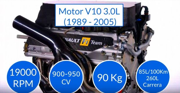 Los grandes motores dominadores en la F1 fueron los motores V10, los cuales se ocuparon desde el año 1989 hasta el 2005. Estos motores eran extremadamente ruidosos y poderosos. Sus características son: