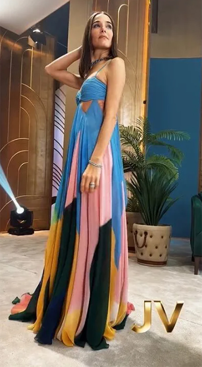 “Predomina el azul claro y hay aberturas que drapean el escote. Muy fresquito, aunque bajó la temperatura”, agregó la nieta de la leyenda de la televisión argentina.