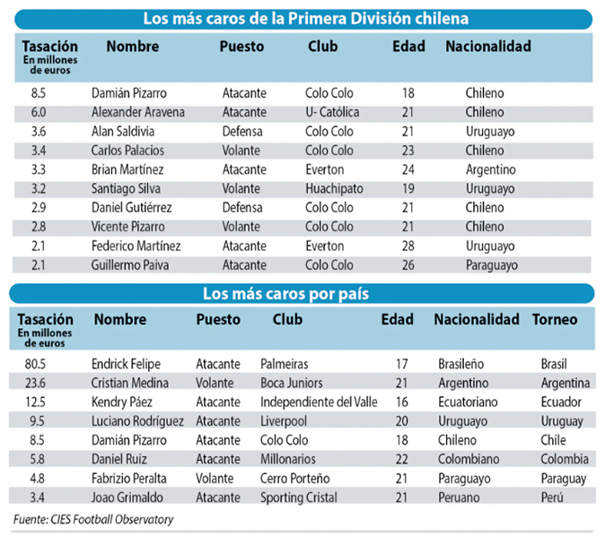 En ese contexto, en Chile manda Colo Colo como la institución con más futbolistas costosos en una lista de 10 deportistas. Así, el jugador más valioso es Damián Pizarro, quien está avaluado en 8.5 millones de dólares.