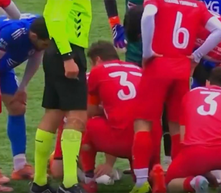 Acto seguido, el animal cayó al piso, donde a los pocos segundos recibió la ayuda de uno de los futbolistas que estaban disputando el partido, la de Gani Çatan.