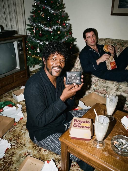 Con mucho espíritu navideño, en la página de Facebook “Quentin Tarantino Fans Club” se publicó una simpática foto, donde ambos sicarios, cómodamente sentados en el living de una casa, aparecen recibiendo sus respectivos regalos de Navidad.