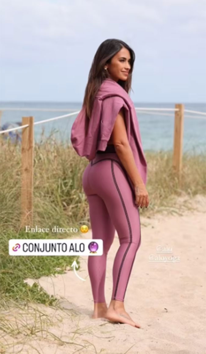 Roccuzzo es partner de la marca Alo, dueña del diseño que vistió la pareja de Messi y el cual tiene un valor cercano a los 500 dólares en lo que respecta al sujetador superior, la calza y el buzo “vanguardista”.