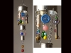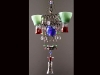 También hace pequeñas lámparas como esta que está hecha tomando como base cortadores de galletas, y tiene agregados un vaso antiguo, un antiguo salero, una llave de la escuela de Londres, una pieza de arcilla de las tuberías del río Támesis, botones azules antiguos comprados en Portobello Road Market, semillas, una antigua campana de metal, monedas (céntimos de francos o de yenes japoneses)