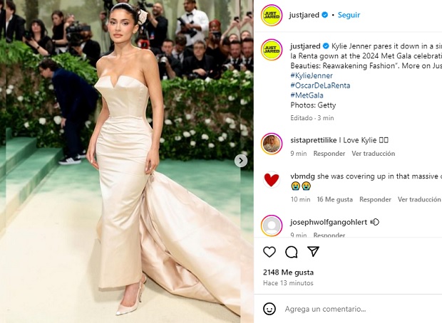 Kylie Jenner optó por un diseño de Oscar de la Renta, confeccionado de satén de doble faz, en un tono vainilla, que presentaba un corpiño de estilo cónico, cintura ceñida y gran falda en corte trompeta.