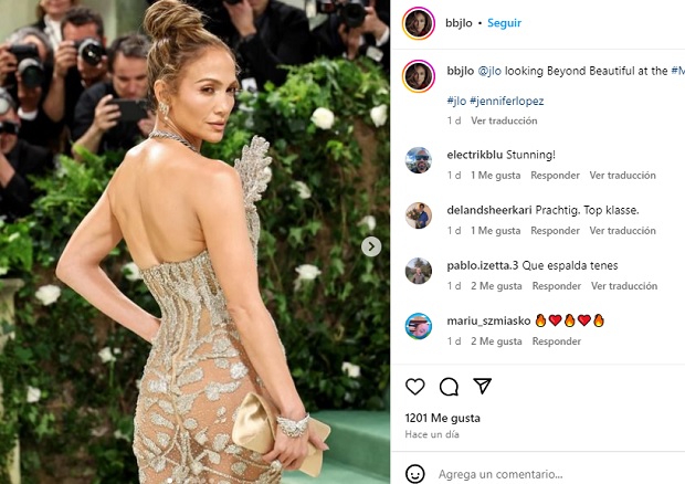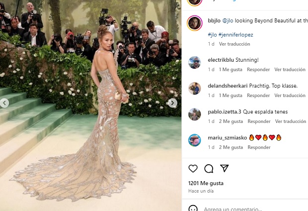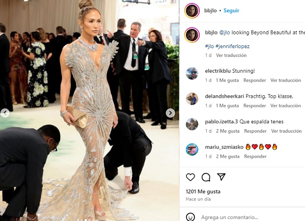 Siguiendo con su tradición de sorprender, JLo no defraudó en cuanto a su look y llegó bañada de glamour al evento cuya temática de este año fue The Garden of Time, inspirada en el cuento de J.G.Ballard del mismo título (1962).