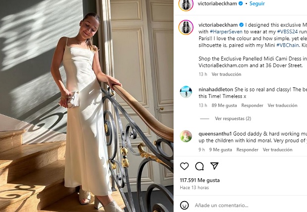 Ahora, ambas presentaron el primer diseño que hicieron juntas. “He diseñado este exclusivo vestido Midi Cami junto a Harper”, anunció Victoria en sus redes sociales, con una foto en la que aparece su hija luciendo el modelo.