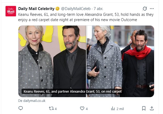 No podría estar más feliz: Keanu Reeves se dirigió a la premiere de su nueva cinta, que lleva el título de “Outcome”, y lo hizo acompañado por su pareja Alexandra Grant. Ambos fueron vistos tomados de la mano, señal de lo bien que marcha la relación.
