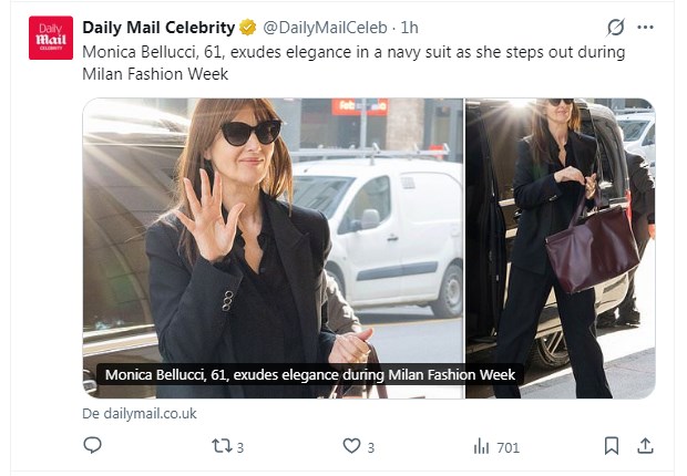 Monica Bellucci marca tendencia usando un elegante traje negro en la Milan Fashion Week