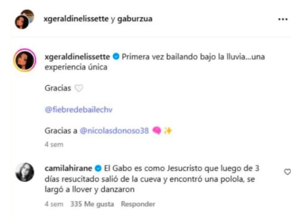Pero como si esto no fuera suficiente, apareció Camila Hirane (amiga de Omegna), quien atacó en forma brutal a Urzúa. En su mensaje, dio a entender que está en una relación con Geraldine Muñoz, su compañera en Fiebre de Baile. Fue tal el repudio que recibió la también artista, que luego acabó borrando la hiriente opinión.