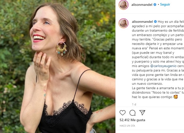 “Hoy es un día feliz; le agradecí a mi pelo por acompañarme durante un tratamiento de fertilidad, un embarazo complejo y un parto muy terrible. ‘Gracias pelito pero necesito dejarte ir y empezar una nueva era’. Pensé en este momento (que puede ser muy banal y superficial) durante todo mi embarazo y puerperio y solo me atreví hoy”, comenzó su mensaje.
